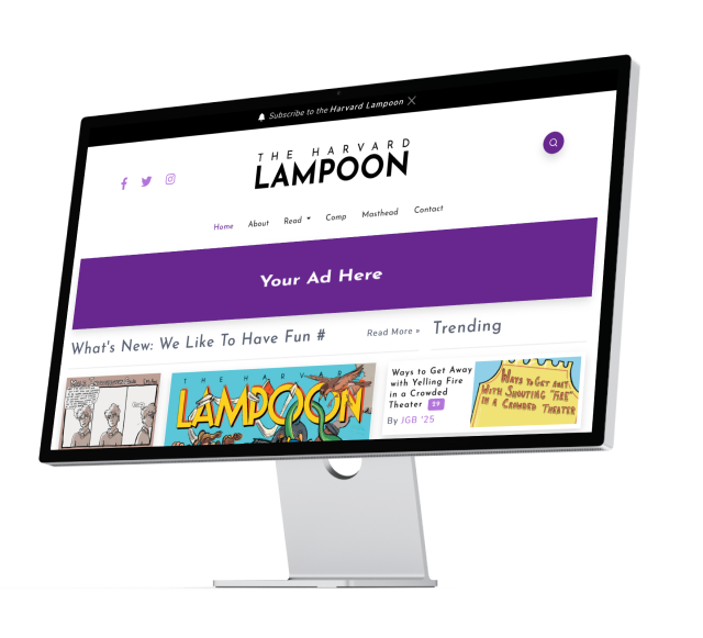 Our website, harvardlampoon.com, has experienced tremendous audience growth with the launch of an all-new, redesigned website in Fall 2020. With fresh jokes, long-form pieces, comics, and other humor uploaded daily onto the site, harvardlampoon.com offers a tremendous opportunity to connect with both the Harvard community as well as the Lampoon's global audience.